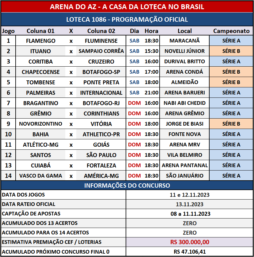 Programação da Loteca Posted on 6 de novembro de 2023 by Ednaldo Ferreira Leave a comment Compartilhe isso: Previous Return to LOTECA 1086 – PROGRAMAÇÃO OFICIAL