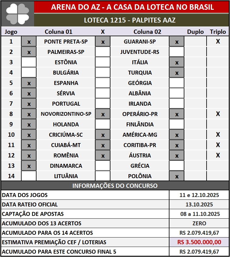 Palpites da Loteca Posted on 9 de outubro de 2025 by Ednaldo Ferreira Leave a comment Compartilhe isso: Previous Next Return to LOTECA 1215 – PALPITES / HISTÓRICOS
