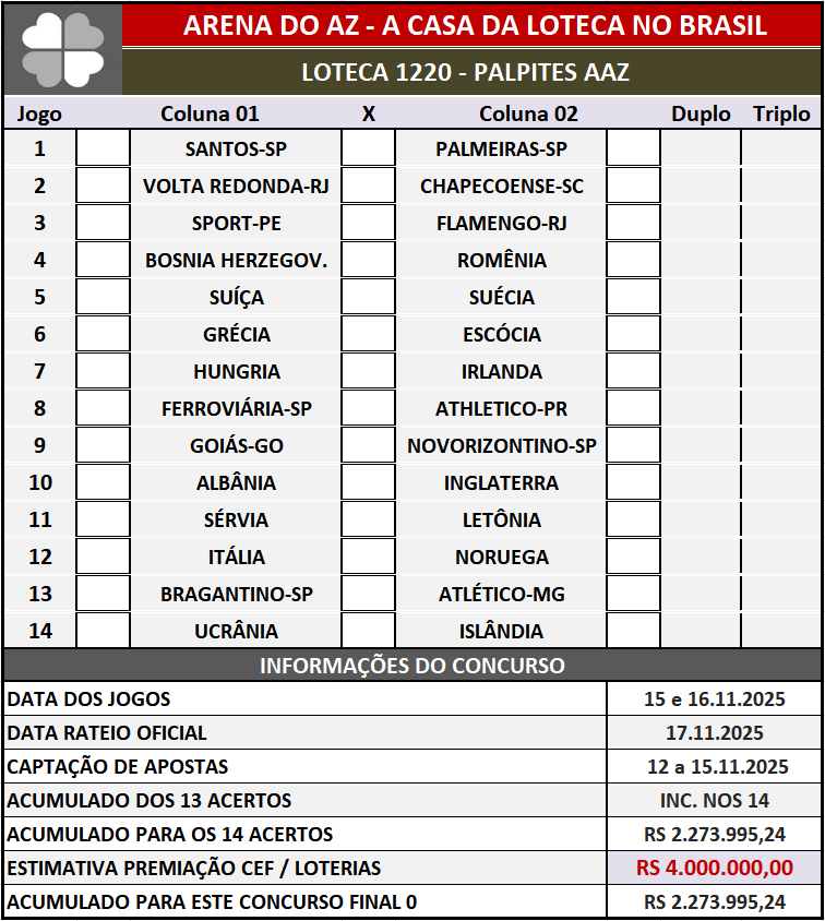Palpites da Loteca Posted on 11 de novembro de 2025 by Ednaldo Ferreira Leave a comment Compartilhe isso: Previous Next Return to LOTECA 1220 – PALPITES / HISTÓRICOS